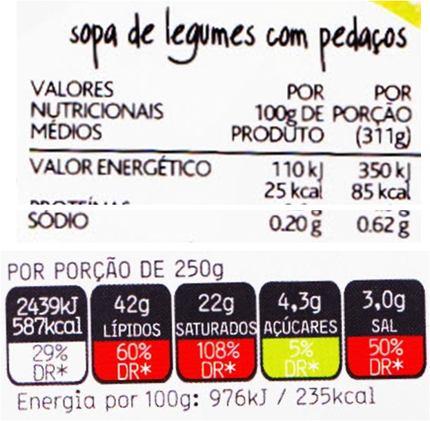 Comentário: o conteúdo de sal/sódio de uma refeição já preparada que se vende no supermercado Continente em 2015-0405 é a seguinte: Sopa de Legumes com 311 g (0,62 g de sódio ou 1,55 g de sal) e Bacalhau à Brás com 250 g (3,0 g de sal). Estes dois componentes de uma refeição tem uma dose total de sal de 4,55 g ou seja quase o máximo de sal recomendado por dia.